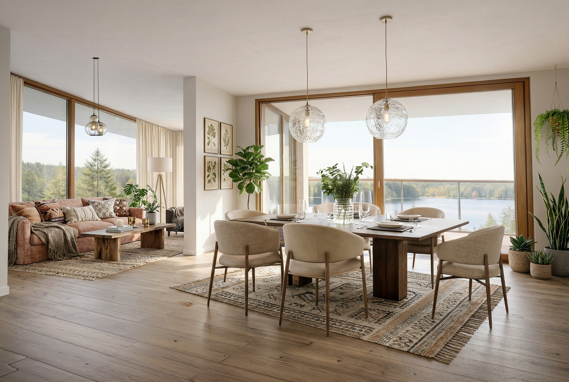 Aluminiowa stolarka trzyszybowa wpuszcza naturalne światło i łączy wnętrze z krajobrazem.