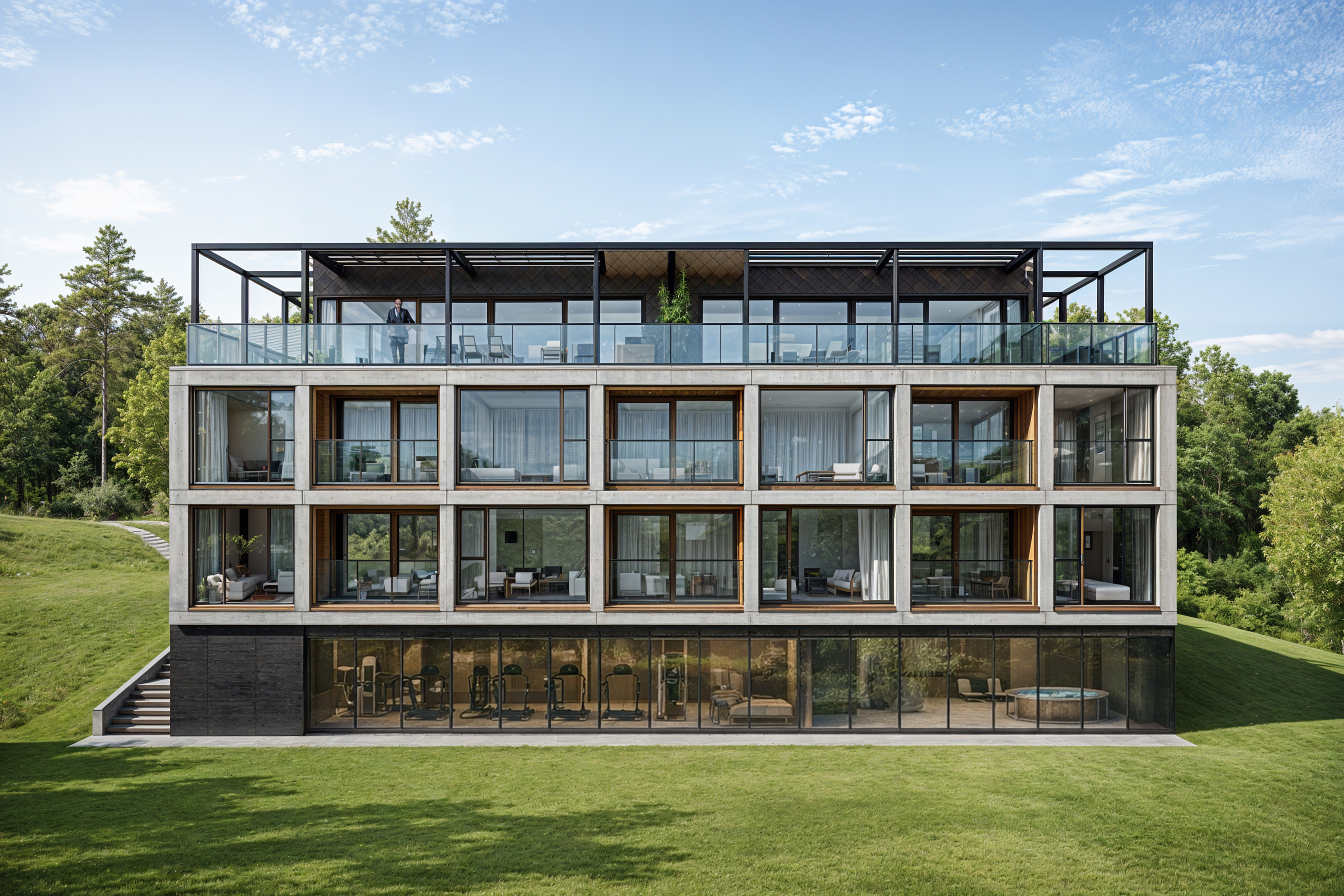 Budynek wykorzystuje naturalne ukształtowanie terenu, otwierając apartamenty na panoramę wody i lasu.